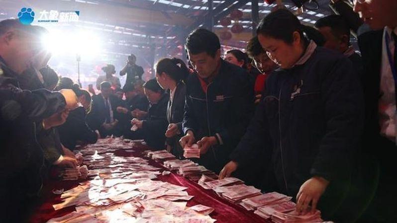 大象新聞報導,2023年1月,「河南一企業年終獎堆成錢山」登上多個社群媒體平台熱搜,公司老闆也被網友戲稱為「最愛發錢老闆」。畫面中,該企業在年終獎發放現場壘起現金牆,領獎員工紛紛抱著成堆現金下台。