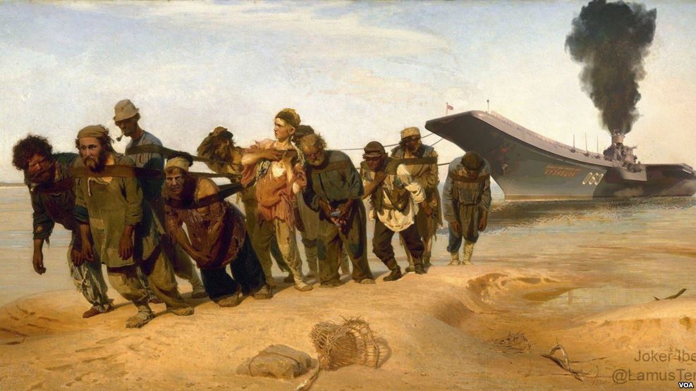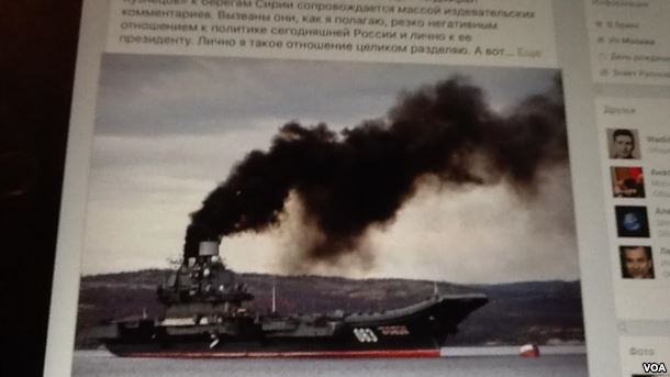 前往叙利亚的俄罗斯航空母舰一路喷吐黑烟引起当地社交媒体一片冷嘲热讽。人们嘲笑这艘老旧航母如同百年前的烧煤船。有评论说,普京总统虽然想借此展示军力,但却反映了俄罗斯的真实国情。这艘俄罗斯唯一的航母同中国的辽宁舰是姊妹舰。