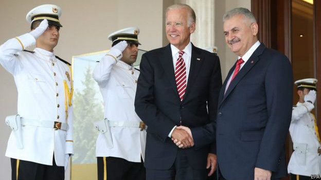 拜登是自从土耳其发生了流产 的政变以后访问土耳其的最高级别西方官员。他否认美土关系受到影响。美国副总统拜登确认,美国军机为这次行动提供了空中掩护。