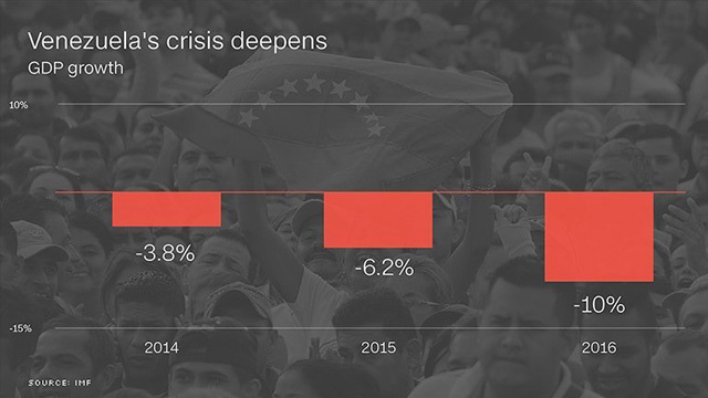 2014年委内瑞拉经济增长为-3.8%,2015年委内瑞拉经济增长为-6.2%,2016年委内瑞拉经济增长为-10%。