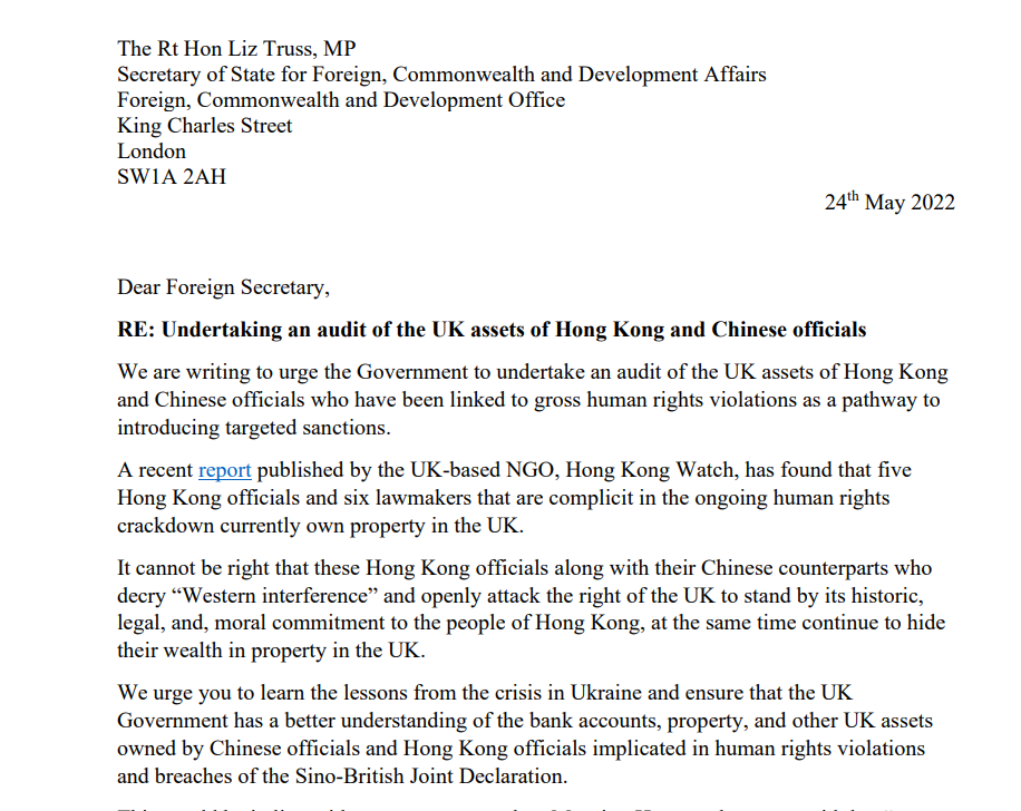 这次联署共获110名跨党派英国国会议员参与,包括86名英国下议院议员,以及24名上议院议员。他们致函英国外相特拉斯(Liz Truss),促请英国政府审查和侵犯人权有关的中港官员在英国的资产,为推出针对香港的制裁令而铺路。