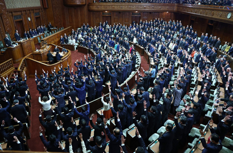 矢板明夫在臉書發文說,今天日本首相高市早苗解散了國會,換言之就是「開除了」所有的眾議院議員。有趣的是,那些瞬間失去身分的議員們,卻在議場內一齊舉起雙手,三呼「萬歲」,形成一幕既荒謬、又極具日本政治特色的景象。但今年有一部分在野黨議員因為抗議高市首相過早解散國會,而沒有起身高呼萬歲。